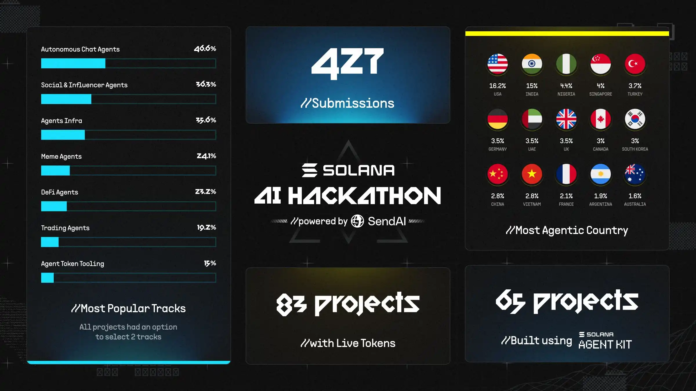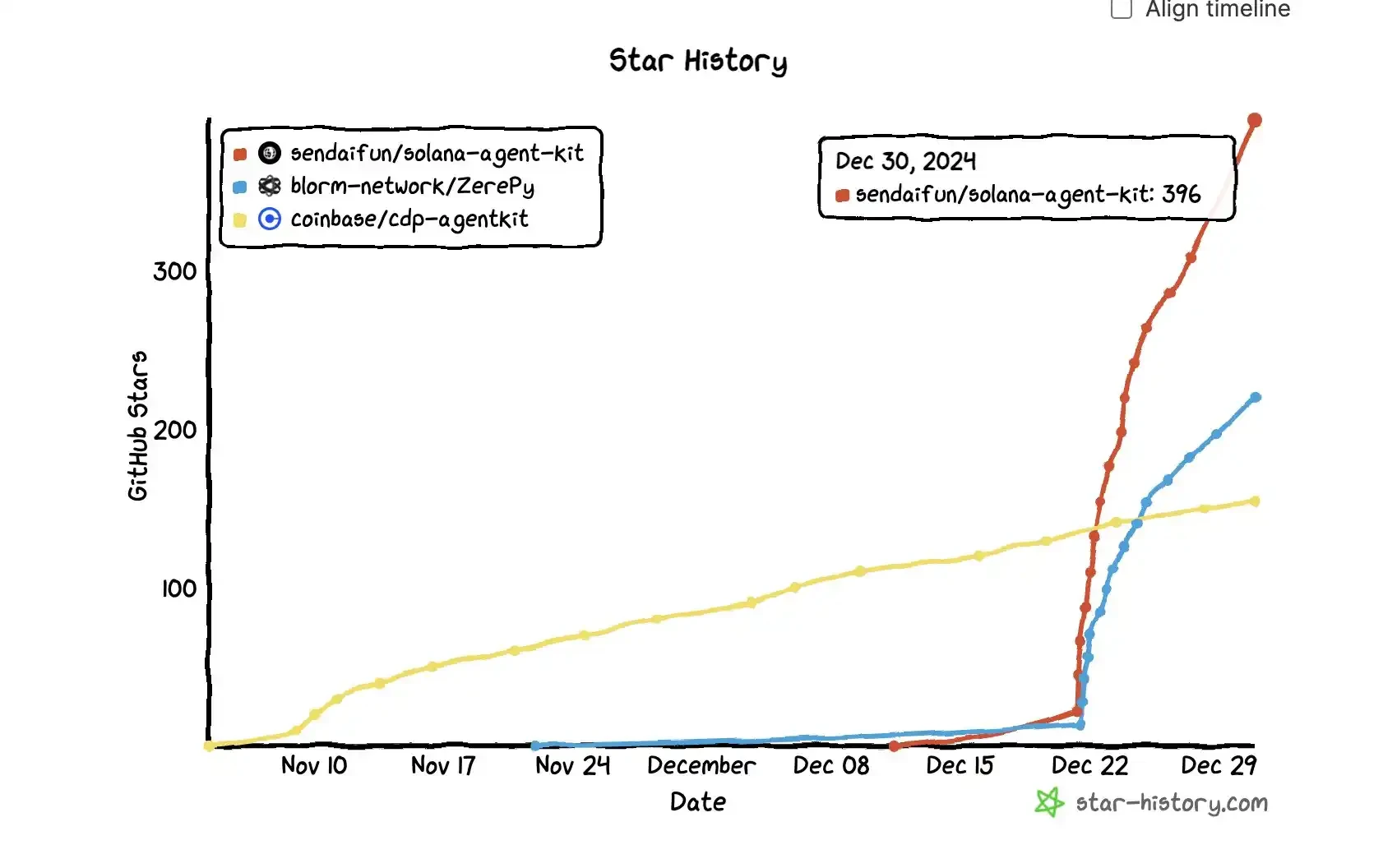 而由 Send AI 主办的黑客松在前几日停止收取名单,最后有 427 个项目成功提案。Solana Agent Kit 公布短短几周内,使用 Solana Agent Kit 开发的项目就高达 65 个。而在名单结束后,使用该工具而未参赛的项目更是不计其数,在 2024 年末该开源架构的星星数已经远远超过 Zerepy 和 coinbase 的 cdp agent kit。