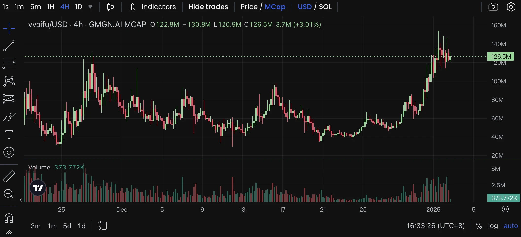 据 GMGN 数据 ,VVAIFU 市值接近历史新高,目前市值为 1.26 亿美元。