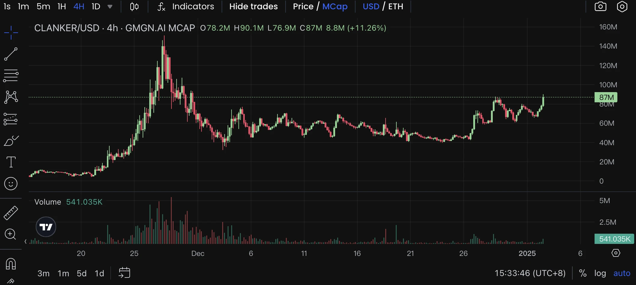 据 GMGN 数据 ,CLANKER 市值从最高一度突破 1.4 亿美元,目前市值为 8700 万美元。