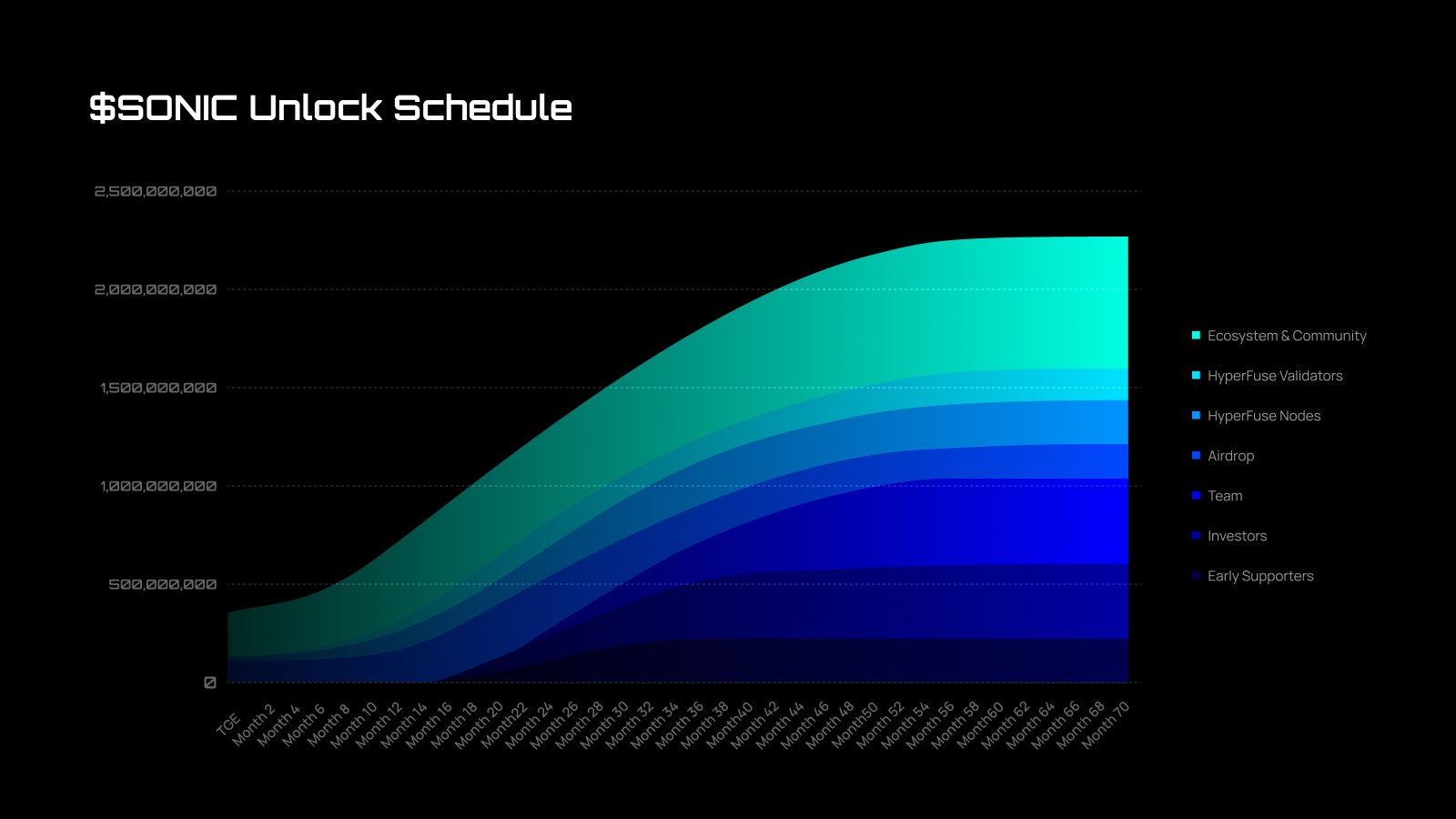$SONIC 将在 6 年内释放,届时,所有$SONIC 将全面流通。自代币推出后的前 12-18 个月内,不会解锁任何团队和投资者代币,且锁定的代币无法进行质押。