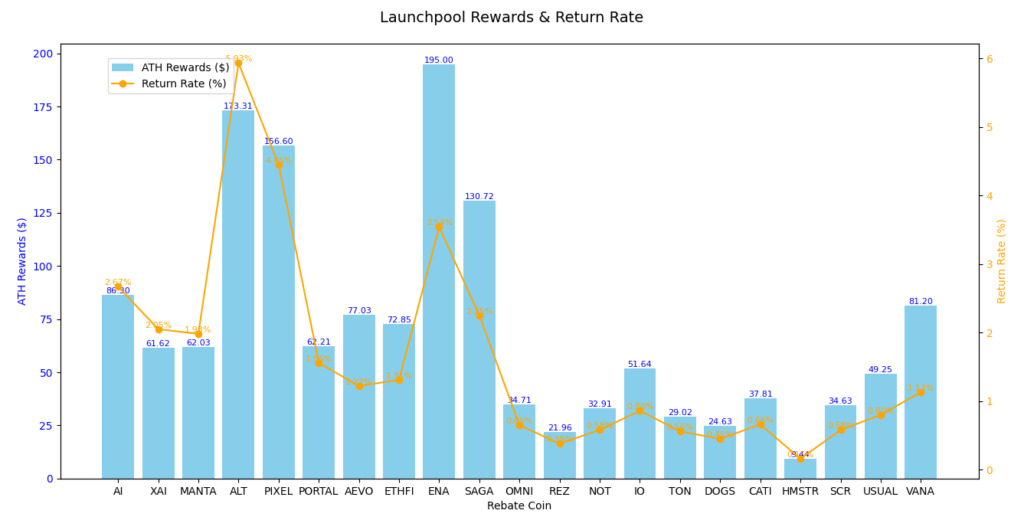 根 PANews 统计,使用者如果从年初𫔭始参与这些专案的 Launchpool 活动,平均每次参与活动可获得 1.6% 左右的代币金额收益。如果按照获得奖励的代币最高价来看,平均每次参与可获得 70 美元的收入。总计这部分收益最高可达到 1,481 美元。参与 21 次的总体收益率约为 47.2%。其中,Altlayer 的活动收益最高,约为 5.93%,收益金额达到 173.3 美元。PIXEL 的收益次之,收益率约为 4.45%,收益金额约 156 美元
