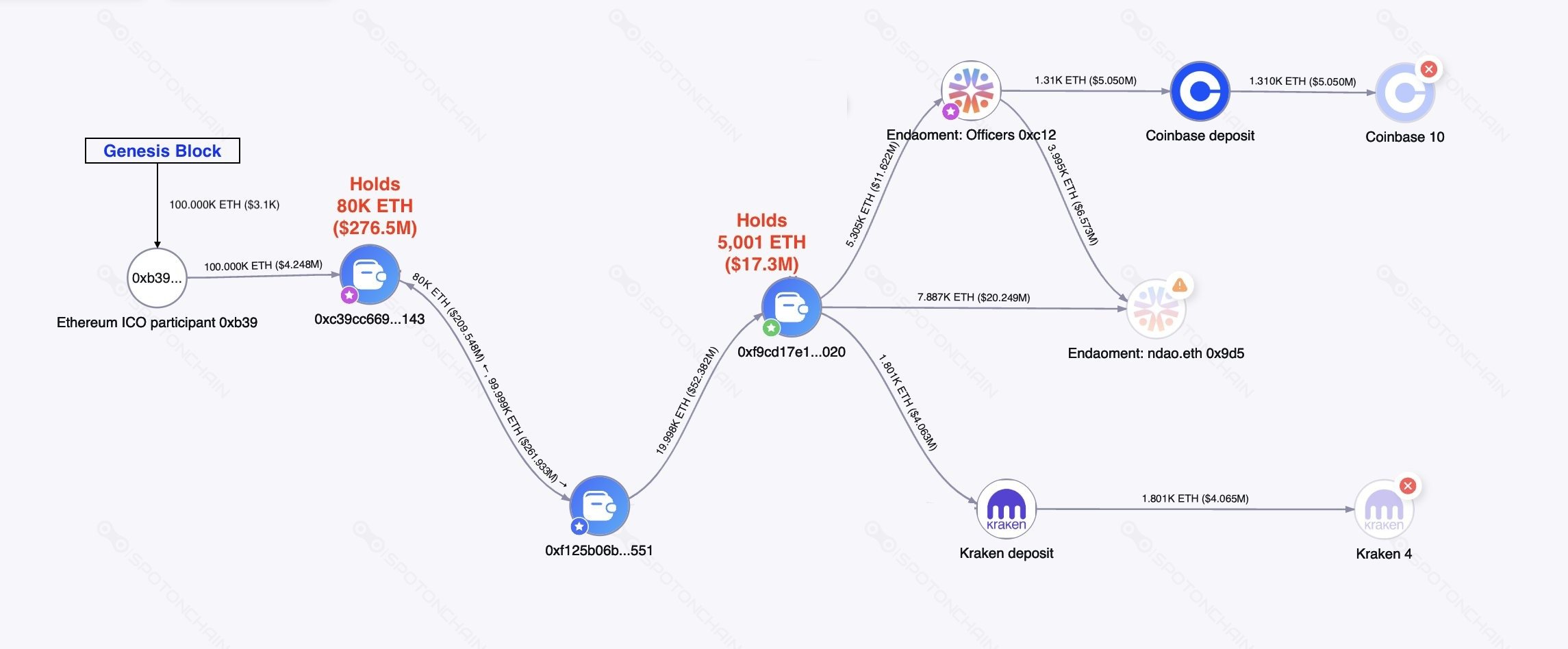 值得注意的是 ,这 3,690 枚 ETH 来自一位以太坊 ICO 巨鲸,他在 2015 年 7 月创世区块时获得了 10 万枚 ETH,目前他已出售了 13,190 枚 ETH,并在两个钱包中仍持有 85,000 枚 ETH(现价值近 2.945 亿美元)。