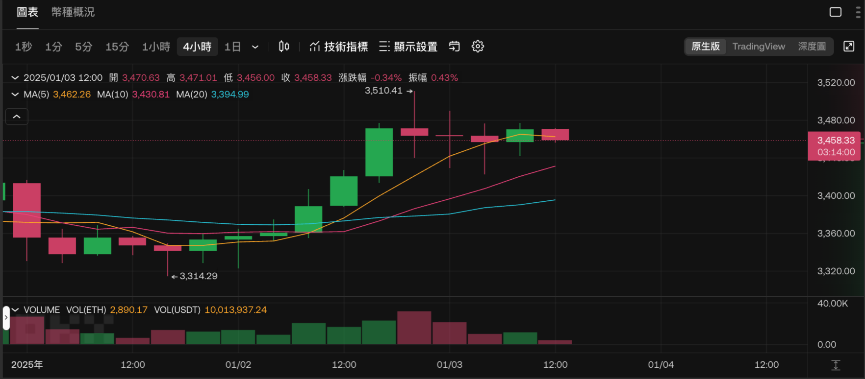 以太坊币价方面,ETH 自步入 2025 以来,已从 3,314 美元稳步上涨 5.9% 至最高 3,510 美元,目前报 3,458 美,近 24 小时涨幅缩窄至 1.13%。