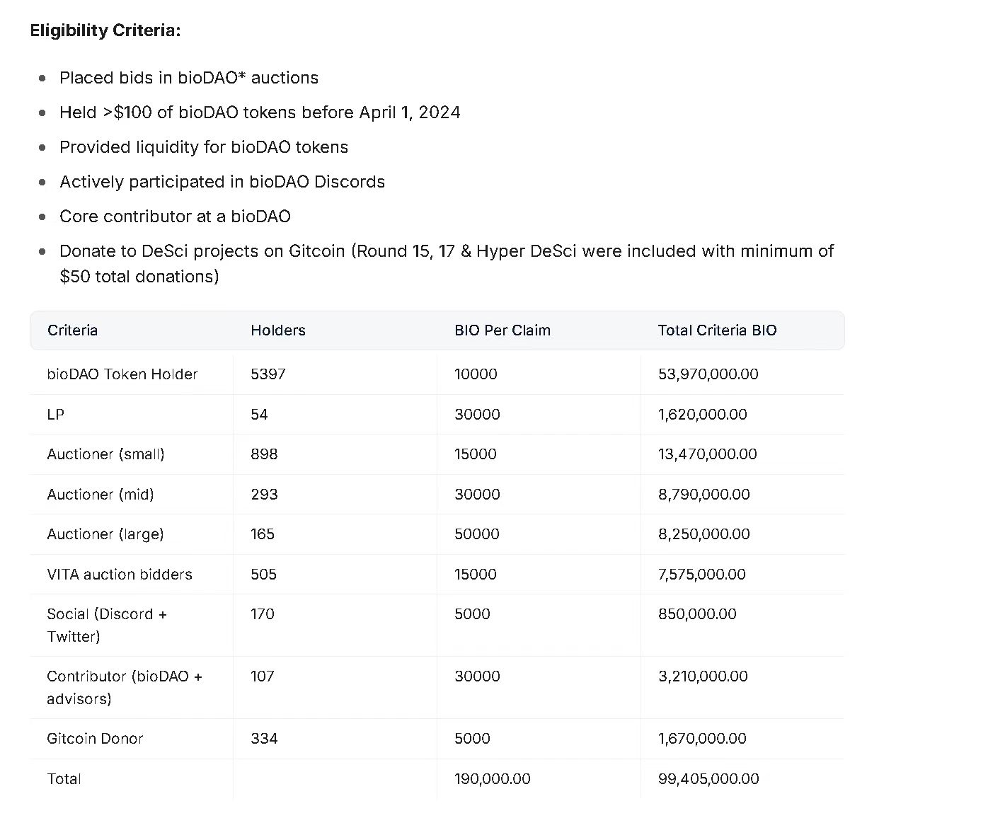 在空投方面,3% 的 BIO 代币总供应量用于空投,超过 8,500 个地址符合资格,空投的快照日期为 2024年4月1日,用户可领取 vBIO(锁仓 BIO),可立即兑换为 $BIO。$BIO 代币不可转让,直到治理投票解锁。