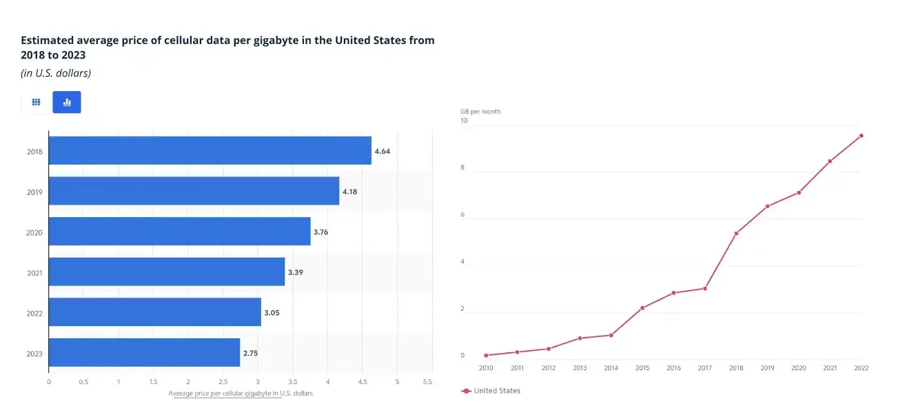 进一步比较发现,Roam 还有潜力成为用户本地生活的主要流量供应商。如结合 Statista(下左图) 和 OECD (下右图) 统计显示,目前平均每位美国人每月花费约 30 美元,消耗 1 0G 左右的流量。结合 Roam 使用者在非漫游情况下,通过参与 OpenRoaming 建设,每个月的无线接入成本可能降低 50% 或更多。除了成本节省之外,Roam 的社区驱动模式极大地增强了用户粘性,并创造了新的运营收入机会。