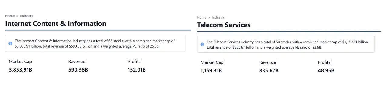 在全球信息化浪潮的推动下,电信行业的传统商业模式正面临着前所未有的挑战。一方面 5G 带来的前期投入压力持续增大,另一方面由于其收入模式变革迟迟不能实现,导致增值服务至今未见起色。传统的用户通讯服务费收入在同行竞争挤压下持续下滑。如下图数据显示,在美国上市的头部公司中,电信服务行业的收入虽然比互联网巨头高出 50%,但其盈利能力却仅为后者的 30%。电信行业的利润率仅为互联网巨头的 20%,净收入也仅维持在 5% 左右。与互联网公司相比,电信运营商的市值仅为其 30%,这显示出投资者对重资产投入的模式和低增长潜力的信心严重不足。