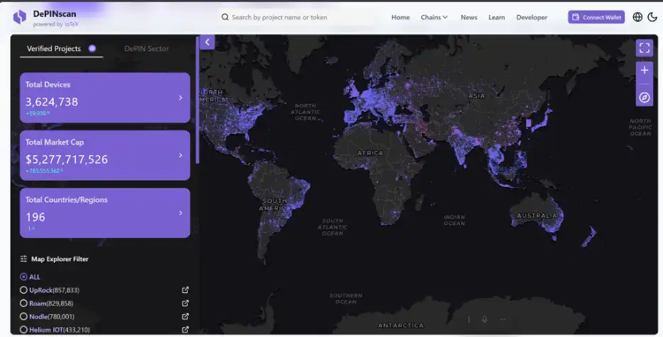 我们关注到在这场变革中,Roam 通过其创新的免费使用模式迅速崛起,成为使用 Web3 技术与电信服务结合的行业挑战者。过去一年中,Roam 在没有大量市场推广投入的情况下,用户数和节点数实现了惊人的增长,用户突破百万,赢得了大批传统运营商的关注和支持,成为去中心化物理基础设施(DePIN)赛道的头部项目。如下图所示,Roam 在 DEPIN 数据分析网站 depinscan.io 中位列第二。