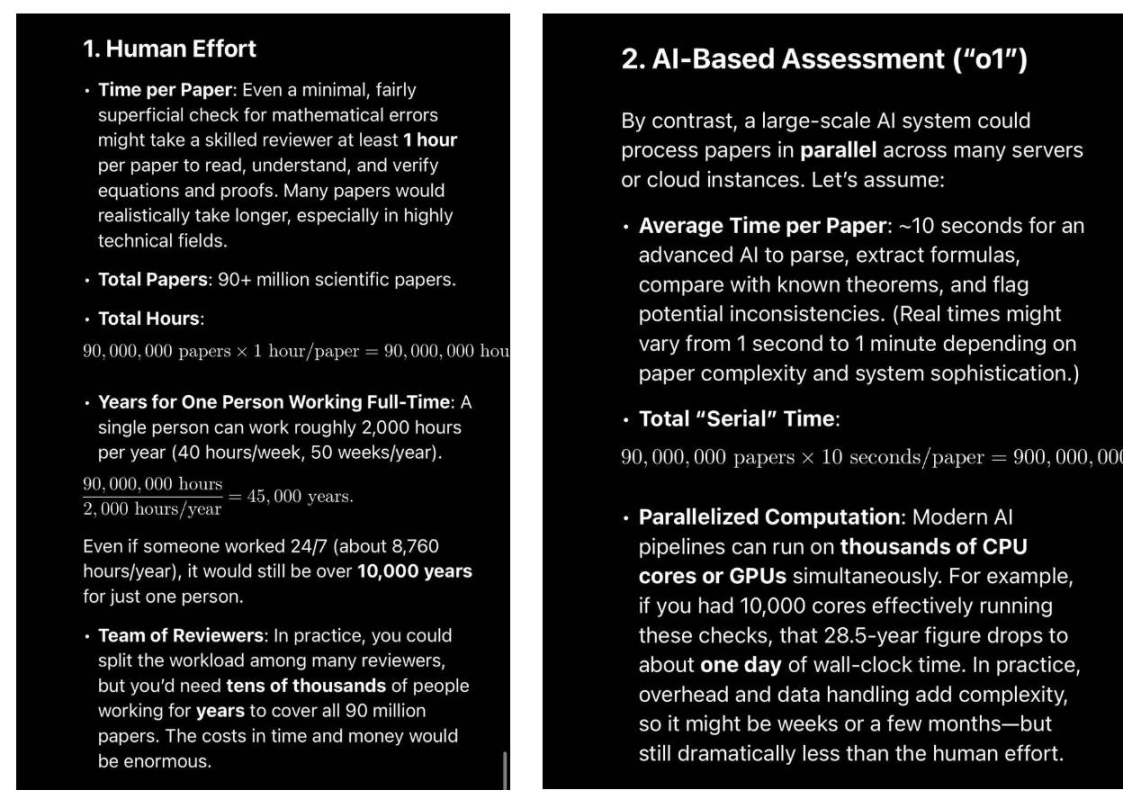 AK 称,YesNoError 有能力审核全球科学文献库中超过 9000 万篇论文中的错误,只需要几周或数月就能完成。如果换算为人工审核则需要数万年,即便组建一个 5000 人的博士团队,也需要近十年时间(而且在这十年间都无法跟上新论文的发表速度),并且保守估计需要 54 亿美元。