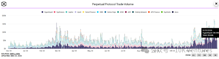 受限于原来链上衍生品赛道本身市场规模较小,得益于 Hyperliquid 在 11 月的腾飞, 11 月 dex/cex futures trading volume 有了显著的提升,一己之力将市占率从 4% 提升至 8% 。
