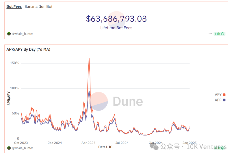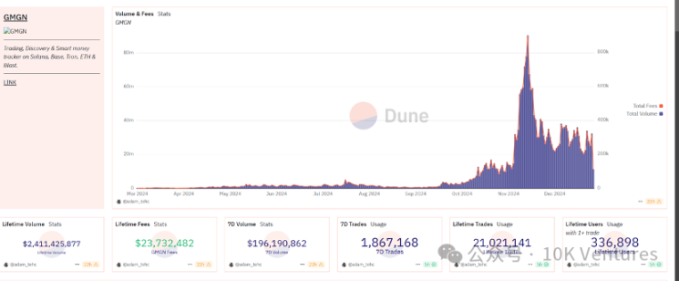 此外,再补充一点关于 GMGN 类「券商」产品的辅助交易工具,作为赛道的头部产品,在最近 3 个月不到赚取了 2000 万美金 + 的收入。这对于 web2 产品经理进币圈提供了新的创业思路。这相比于上个 cycle 看到的 Dune,Tokenterminal 等产品,商业化能力至少强了 2 个数量级,这得益于这轮辅助交易类产品直接切入交易。