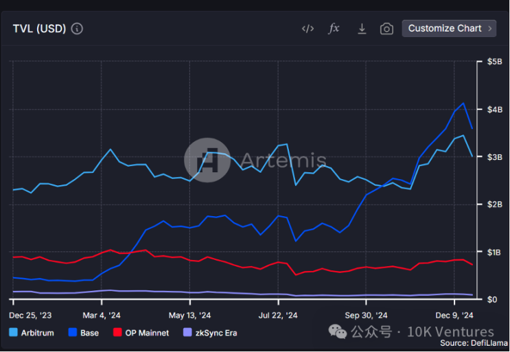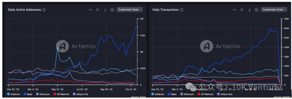 在我们 10 月的月报中,我们曾经重点 call 过 Base 生态的崛起。过了两个月后,无论是 DAU 还是 TVL,Base 目前都大幅领先其他以太坊生态。