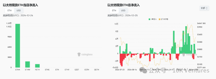 总的来说 ETH ETF 的净流入进展相对 BTC ETF 较慢。在今年 11 月 29 日是分界点,ETH ETF 开始大幅净流入,当天净流入 3 亿美金,是之前 4 个月累计净流入的 2 倍。此后一段时间内,ETH ETF 开始持续净流入,但我们也观察到例如孙宇晨等 crypto native 老 OG 开始抛售以太坊,目前呈现的是圈内抛售,圈外 ETF 增持的趋势。截止 12 月 26 日,ETF 累计持有 3% 的 ETH。