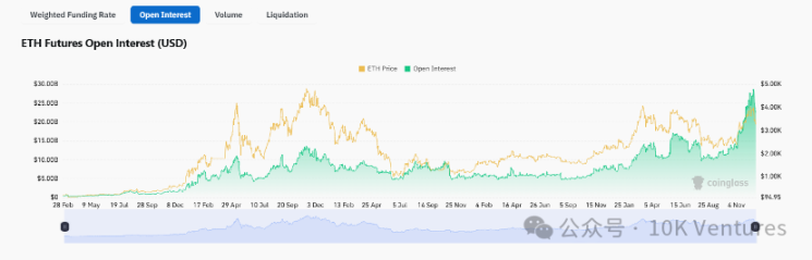Ethena 通过极致化的 delta neutral+eth native staking+governance 币本位补贴做大风险性收益率,从而吸引 TVL。Ethena 商业模式我们已经分析太多,这里不再做太多补充。但值得一提的是,近期 ETH OI 开始大幅增长,相比于 9 月,OI 增长了 2.5 倍,ENA 的天花板逐渐打开。ENA 在趋势行情下,大概是涨的最猛,跌的最猛的代币。