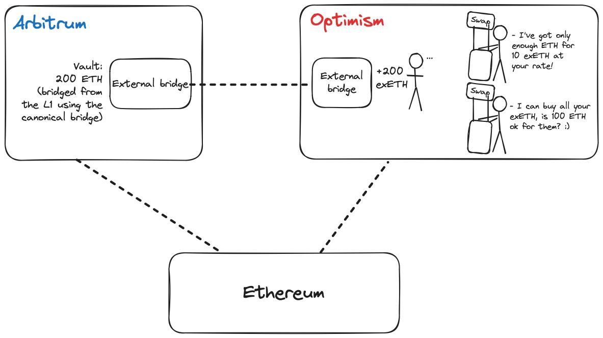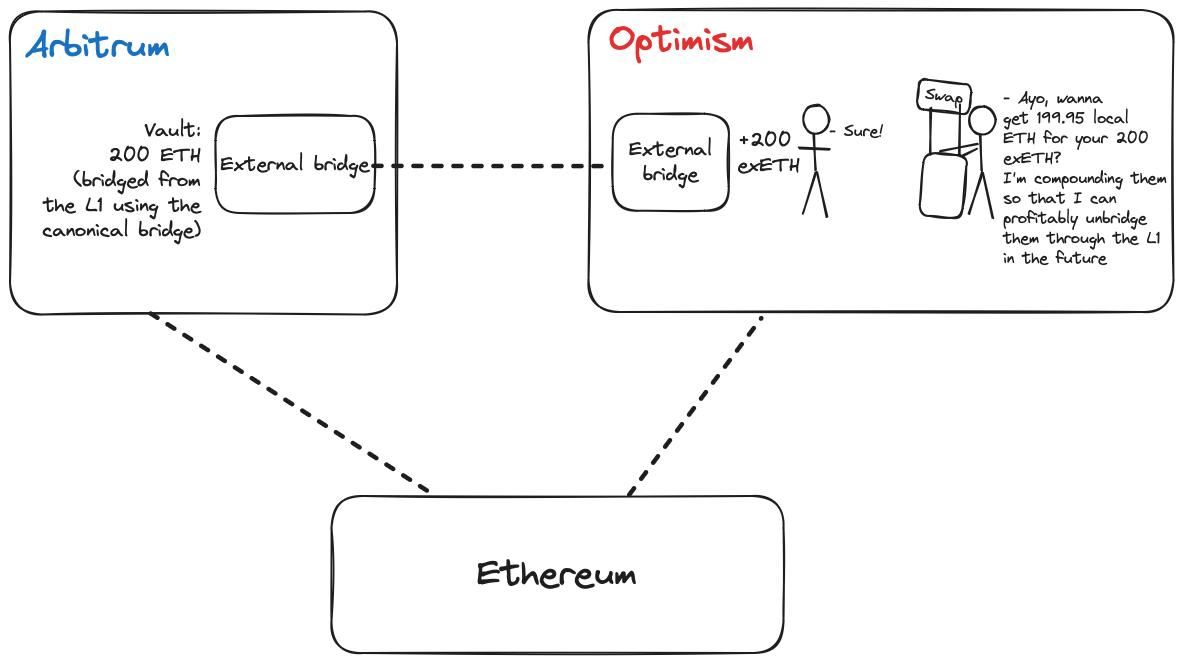 追求效率的 Rollup 用户必须使用其他跨链桥提供商,这些提供商可以承担待处理的 Rollup 退出的所有权,并在用户期望的目标链上提供即时流动性。当此类桥使用传统的锁定与铸币模型时,我们最终会得到由不同协议发行的代币的多个包装代币,并面临前文描述过的相同问题。