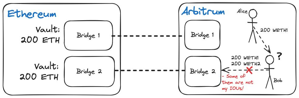 因此,每个跨链代币的价值都与负责在主链上持有存款并在目标链上铸造包装代币的跨链桥提供商挂钩;Bob 的跨链桥提供商只能向 Bob 支付 200 USDC,因为这是其从存款中可以支付的金额;Alice 的 200 USDC 无法通过 Bob 的跨链桥提供商提取,因为它从未收到存款或向 Alice 发出「欠条」。Alice 必须从以太坊上的 Arbitrum 中提取她锁定的 USDC,并通过 Bob 的跨链桥提供商进行桥接,然后 Bob 才能访问剩余的代币。