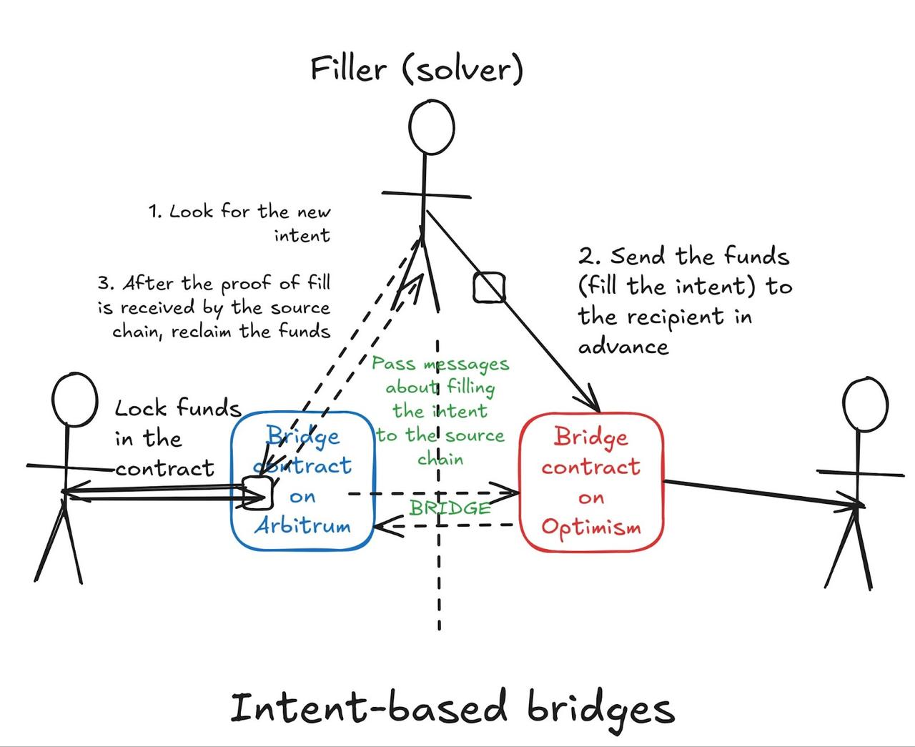跨链意图 允许用户在链之间转移代币,而无需担心跨链桥的底层复杂性。在基于意图的跨链桥中,用户在源链上存入资金,并指定他们在目标链上期望的结果(即他们的「意图」)。称为「填充器」(Filler)或「求解器」(Solver)的专业运营商可以通过提前将请求的代币发送给目标链上的用户来实现此意图。随后,运营商证明转移已发生,以索取源链上锁定的资金作为补偿。