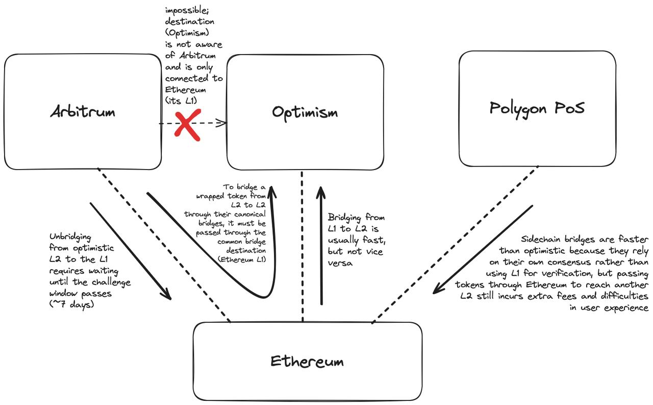可惜的是,侧链桥也与 Rollup 标准桥存在一个共同的弱点:用户只能在一对相连的链之间进行跨链。他们无法使用标准桥跨链到其他区块链。简单来说,目前,你无法使用 Arbitrum 跨链桥将 Arbitrum 桥接到 Optimism,也无法通过 Polygon PoS 跨链桥将 Polygon 桥接到 Avalanche。