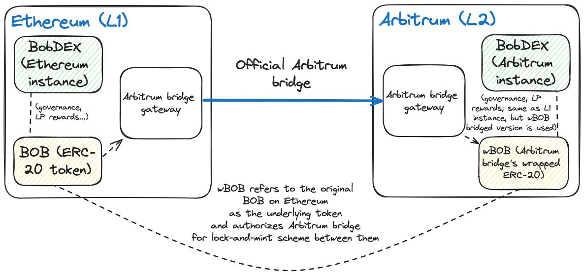 对于与 Arbitrum 上的 BobDEX 交互的用户(例如流动性提供者)而言,应用代币的差异(包装的 BOB 与原生 BOB)并不重要。这是由于 wBOB 代币由 Arbitrum-Ethereum 桥中持有的实际 BOB 代币支持,因此 wBOB 代币持有者可以通过与桥合约交互,轻松地在以太坊上兑换原生 BOB ERC-20 代币。