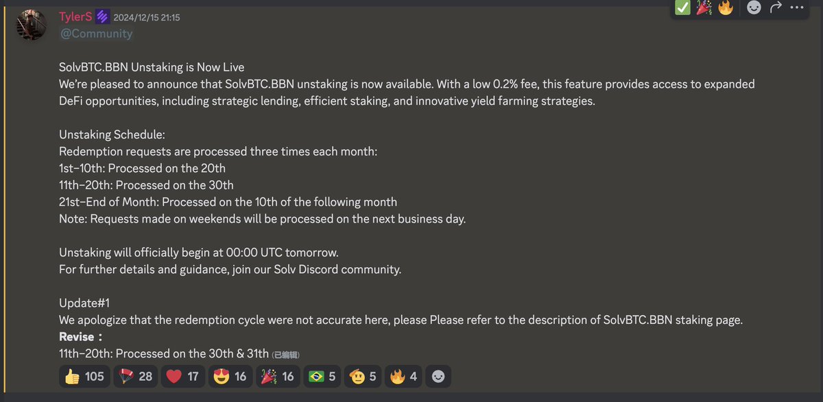 Hans 还声称,SolvBTC.BBN 在 Babylon Cap3 期间 TVL 下滑,暗指 Solv 挪用用户资产。对此,Ryan 表示实际情况是,SolvBTC.BBN 在该日期正式啟动赎回流程,导致 TVL 出现变化。这种变化恰恰是 SolvBTC.BBN 为用户提供流动性与灵活性的体现,而非任何形式的资产挪用。