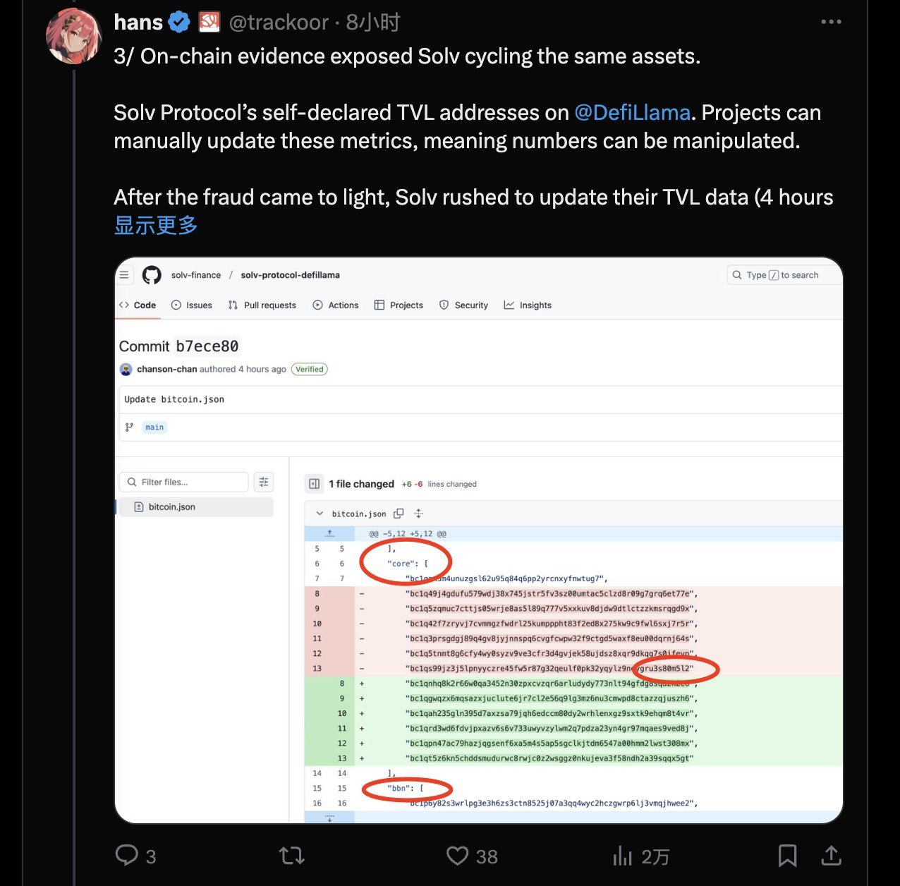 事实上,Hans 提供的 mempool 连结截图,对应的实际是 Solv 的另一收益资产 SolvBTC.CORE,而非 SolvBTC.BBN,这在其自己举证的截图中就有直接证明(如下图)。