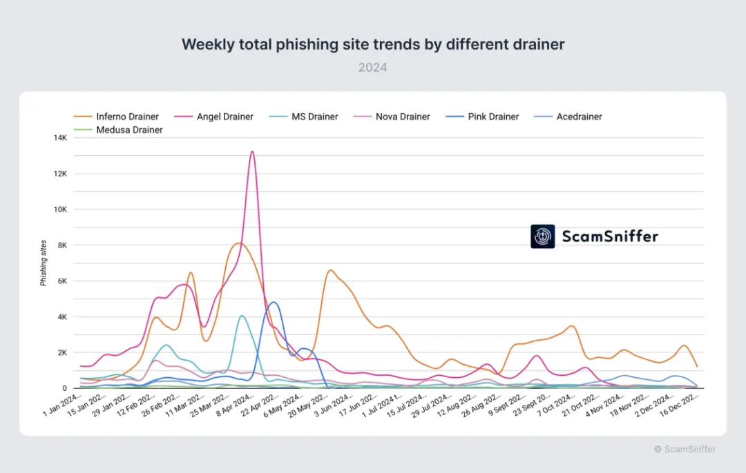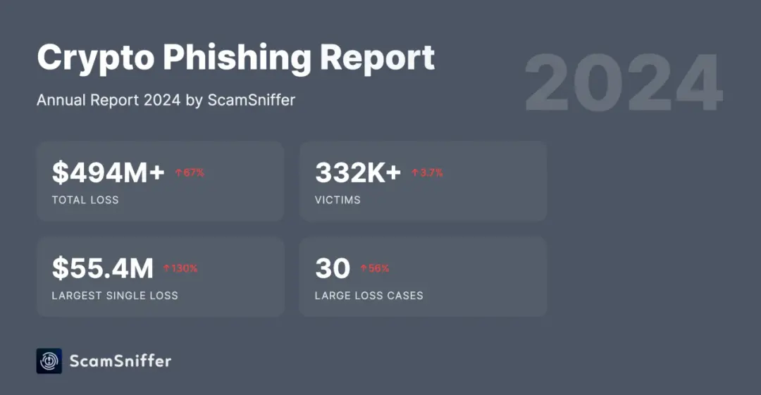 Wallet Drainer 是一种部署在钓鱼网站上,通过诱导用户签署恶意交易来盗取加密资产的攻击方式。2024 年,此类攻击造成约 4.94 亿美元损失,同比增长 67%。虽然受害者数量仅增长 3.7%(达到 33.2 万地址),但单次攻击损失显著增加,最大单笔被盗金额达 5,548 万美元。