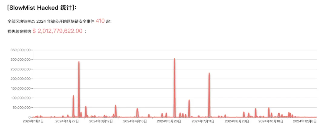 根据慢雾区块链被黑事件档案库 (SlowMist Hacked) 统计,2024 年共发生安全事件 410 起,损失高达 20.13 亿美元。对比 2023 年(共 464 件,损失约 24.86 亿美元),损失同比下降 19.02%。