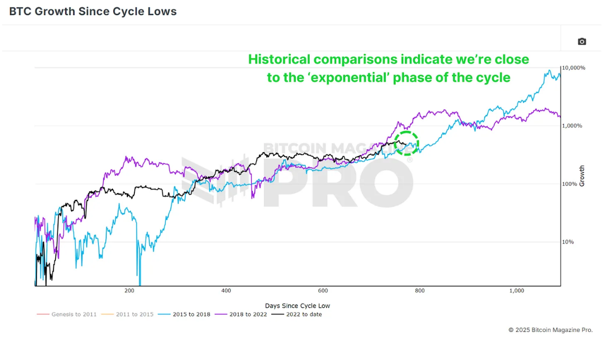从比特币的历史价格走势来看,周期通常在“减半后冷却”阶段持续 6 至 12 个月,然后进入指数增长阶段。根据以往的周期数据,我们正在接近这一突破点。尽管与早期周期相比,回报率可能会有所下降,但我们仍然可能看到显著的涨幅。