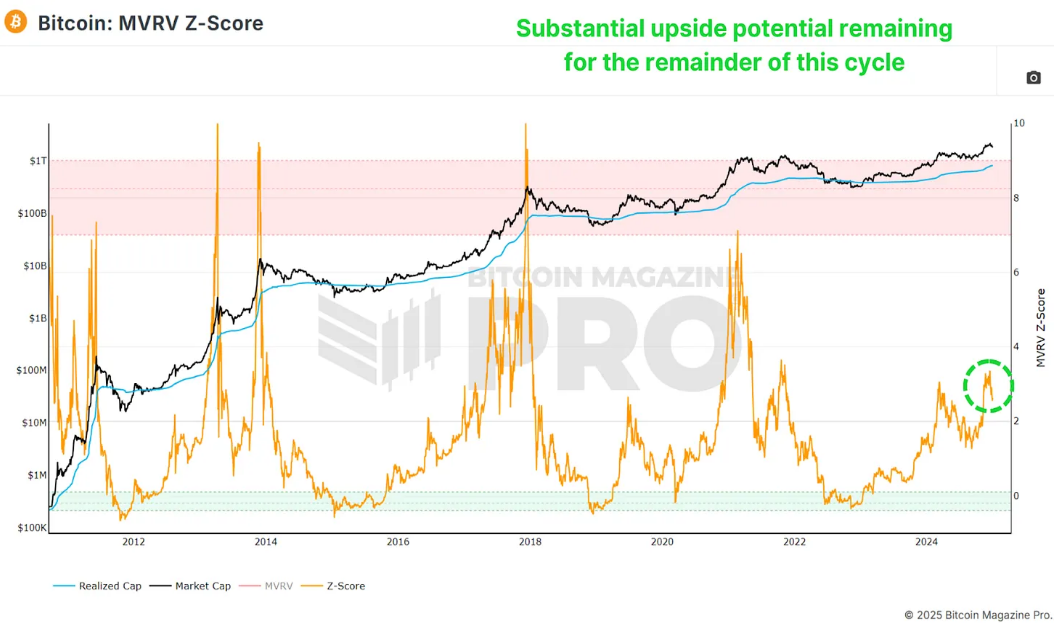 目前,MVRV Z-Score 表明我们仍然有显著的上涨潜力。尽管以往的周期中 Z-Score 曾超过 7,但我认为任何高于 6 的值都意味着市场的过度扩展,需要结合其他指标更仔细地观察市场峰值。目前,我们的水平与 2017 年 5 月相当——那时比特币的价格仅为几千美元。结合历史背景,从当前水平来看,仍有几百个百分点的潜在涨幅空间。