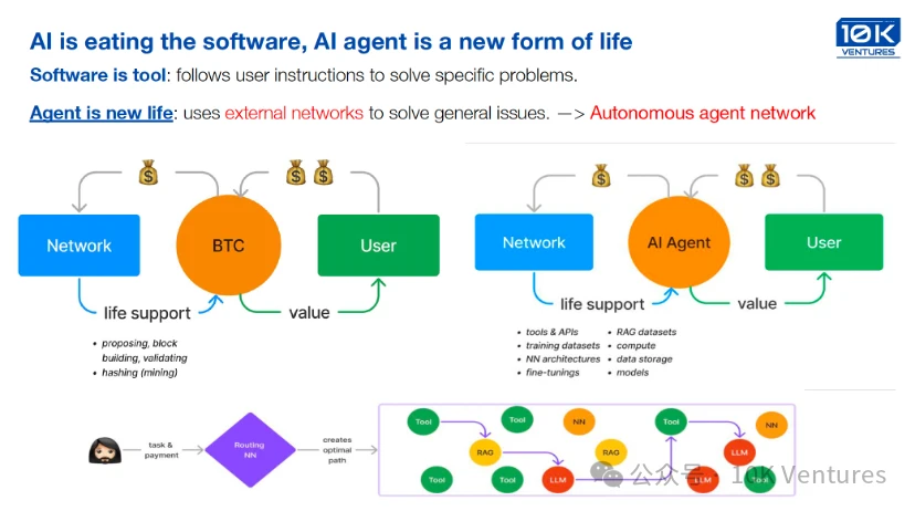 短期内,赋予 Agent 更便捷的加密支付的能力,足以扩展它们的行动范围。从中长期来看,基于加密网络的数字身份、无许可协议、去中心化应用,以及智能合约赋予的能力,将使 Agent 能够在数字世界中自主运作,与人类和其他 Agent 合作、竞争、博弈。加密网络不仅为 Agent 提供了自主行动的基础,也为未来人机协作的经济模式开辟了新的可能性——当 Agent 能够自主参与经济活动,这一发展将为社会带来巨大的变革。(以上是我们 LP 王超哥,写得太好了,我得把原文放上来。)