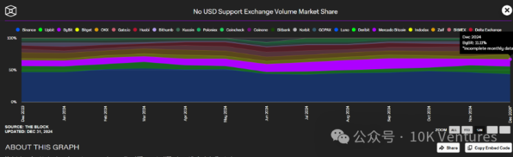 BG 今年的交易量增长,从年初的每天 5-10 亿美金交易量,增长到每天 12 月大几十亿交易量(只有 20% 左右的 trading volume 由伟大的单机币 BGB 贡献,其他都是完全竞争)。市占率从年初的 2.8% 增长到 12 月的 7.8% ,成为超越 OKX,成为非 USD 交易对的世界第四大交易所。