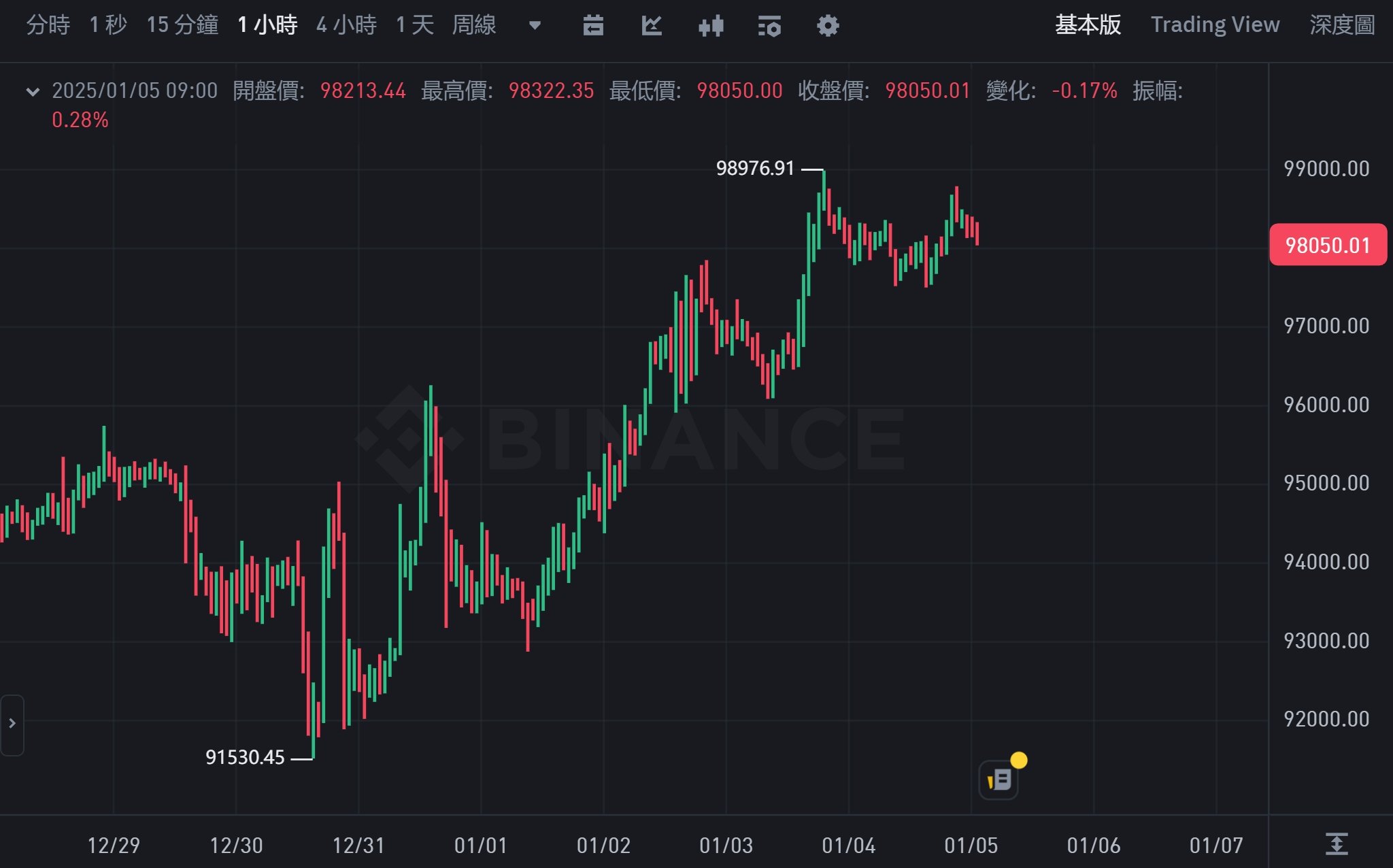 比 特币( BTC )在上月 17 日触及 108353 美元历史高点后持续下跌,但在上月 30 日下探至 91530 美元低点后,𫔭始出现显著涨势,在过去 6 日上涨超过 7%,最高在昨日达到 98,976.91 美元,现报 98,050 美元,近 24 小时涨幅 0.1%。