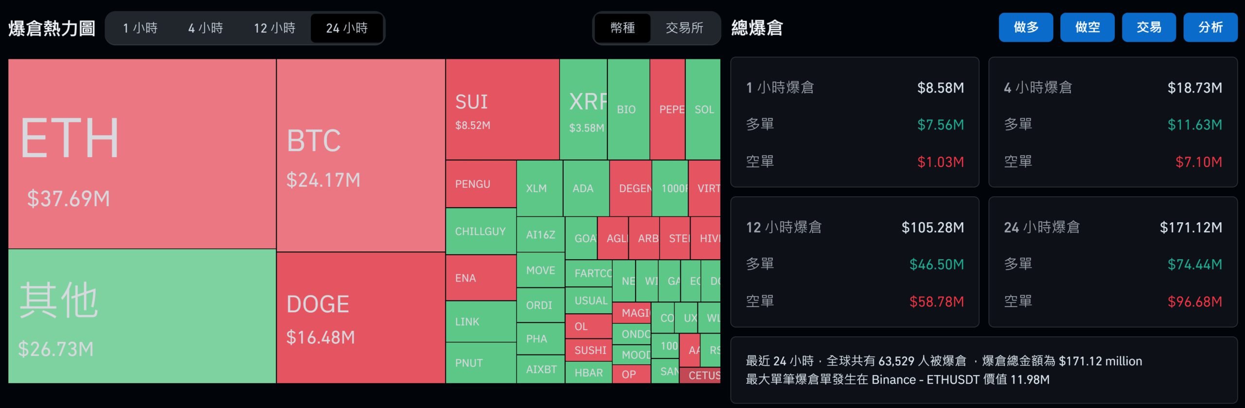 据 Coinglass 数据 显示,过去 24 小时,加密货币全网爆仓金额为 1.71 亿美元,多单爆仓 7444 万美元,空单爆仓 9668 万美元,有超过 6.3 万人被清算,爆仓数据已较为平缓。