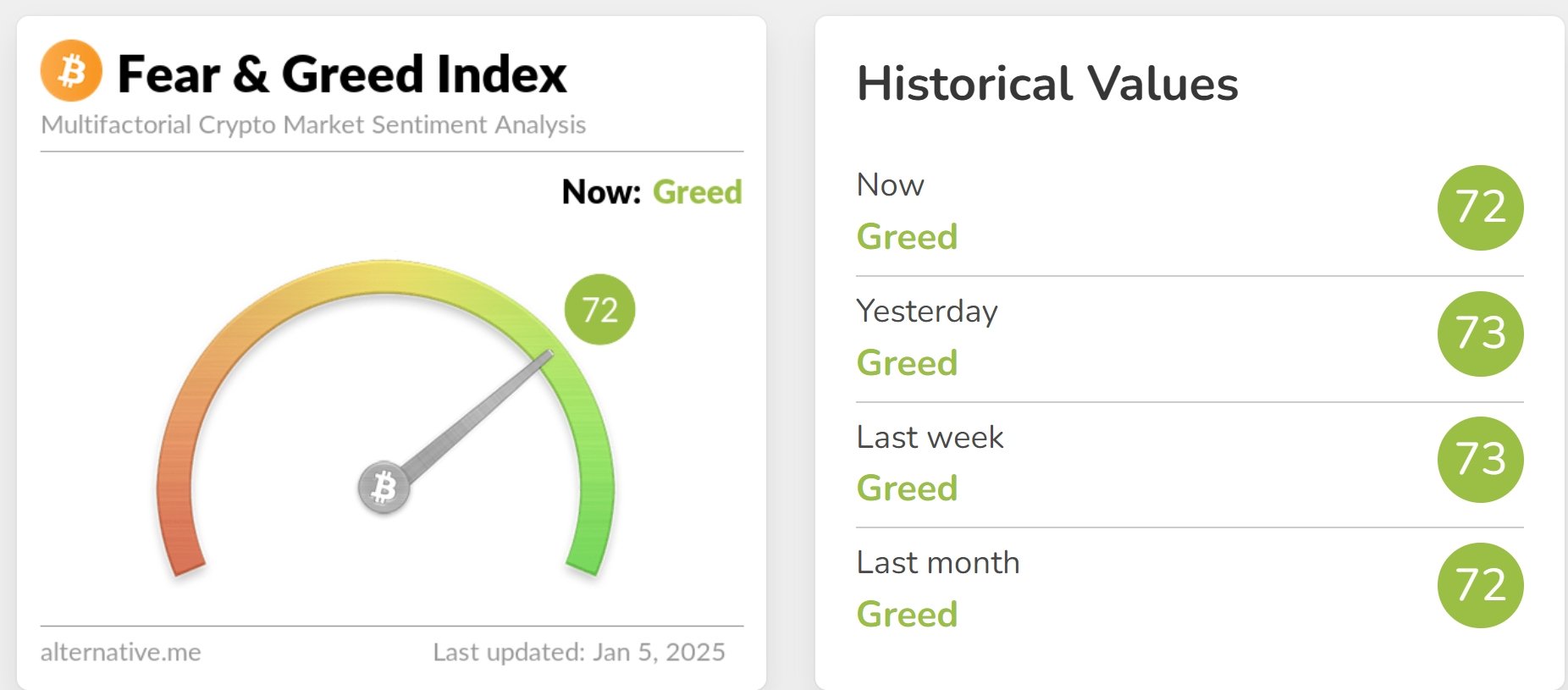 另据 Alternative 数据 显示,今日恐慌与贪婪指数为 72(昨日为 73),等级仍为贪婪。