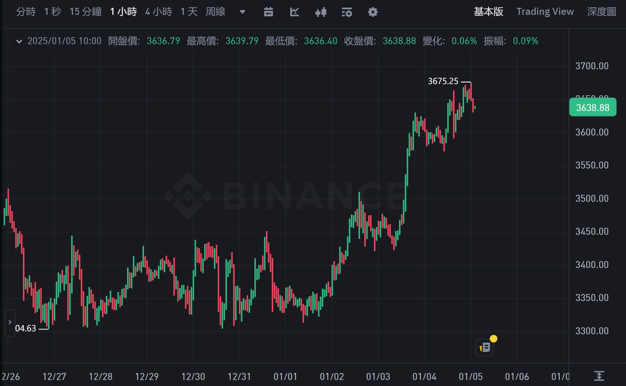 与此同时,以太坊( ETH )在上月 17 日触及 4107 美元高点后,在上月 20 日最低跌回 3101 美元低点,但近期也出现显著涨势,过去 2 周来,已较上月 20 日低点上涨超 17%,现报 3638 美元,近 24 小时涨幅 1.4%。