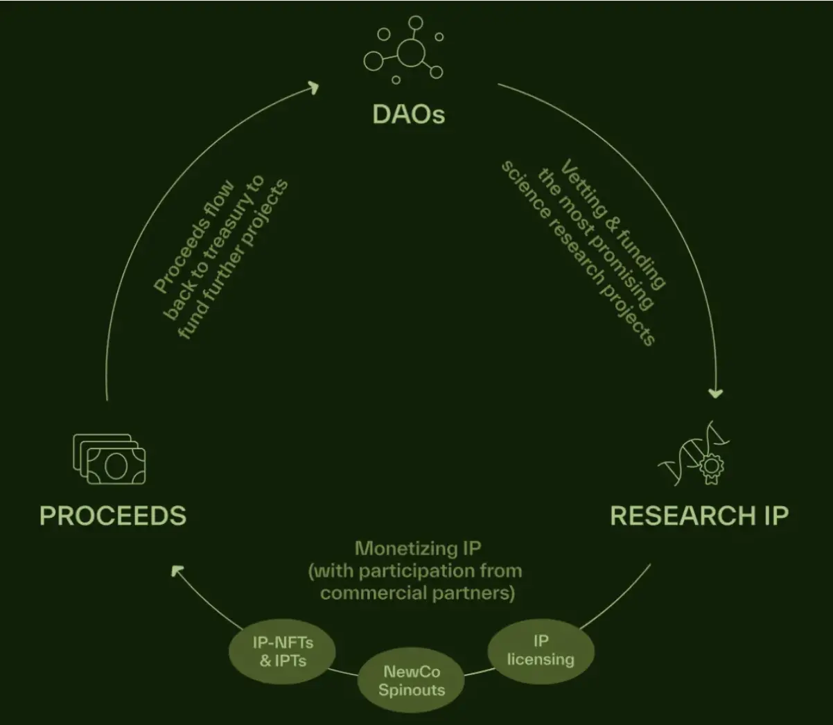 - BioDAOs 发展并持有 IP 代币的所有权。每个 BioDAO 通常持有一个与其特定科学研究领域相关的 IP 代币组合。例如,VitaDAO 开发并拥有 VitaRNA 和 VITA-FAST 的 IPTs 股权。