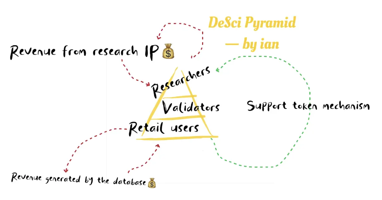 我认为 DeSci 应该是一个金字塔结构,把知识共享全链路的参与者和贡献者划分了不同等级,每一个角色都不可或缺。学者作为金字塔顶端的参与者,贡献最核心的 DeSci 本身的价值,同时也为项目带来爆点,拿新药研发这个场景看,DeSci 如果能参与或促成某种药物的上市,对赛道和项目带来的声量都是无法估计的。社区用户作为金字塔底层的参与者也有底层的玩法,他们维持了整个生态和经济体系的高效运作。