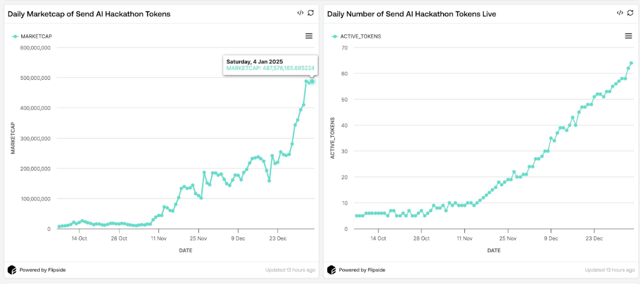 但当时并不知道,这里竟然会成为degens的投机场所。从数据上看,此次黑客松在 1 周内只有 4 万多名访客。现在,每天有 2-3 个黑客马拉松项目速通 5000 万美元市值,累计价值超 5 亿美元。Solana AI 黑客松无意中成为了一个 AI 代币发现平台。
