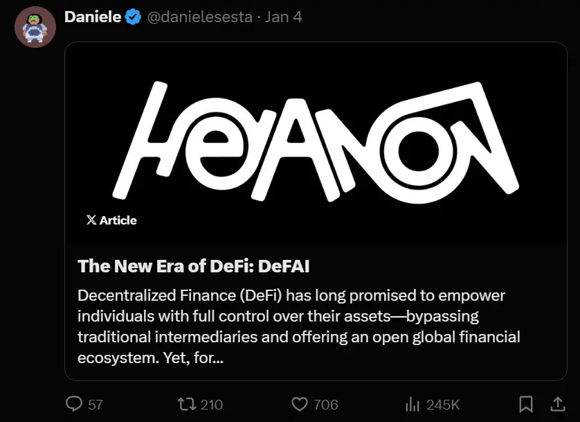 另外,danielesesta 通过 HeyAnonai 的 DeFAI 理论引起了广泛关注。 他宣布 HeyAnon 正在开发以下内容: