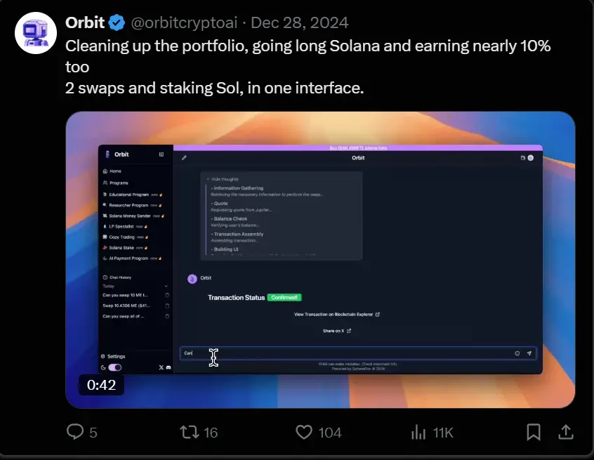 Neur 是第三个推出代币的项目,但由于其开源的特点,迅速在估值上超越了 Orbit。Neur 将自己定位为 Solana 的副驾驶,专为 Solana 生态系统设计。Neur 由 sendaifun 的 Solana Agent Kit 提供支持。