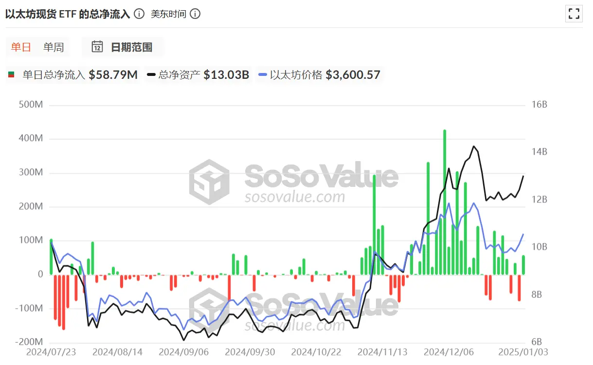 11 月末,其以太坊现货 ETF 甚至出现罕见的 18 日连续净流入,单日最高净流入一度超 4 亿美元。按市值调整后,这相当于比特币每天接近 12 亿美元的资金流入,因为以太坊的市值约为比特币的四分之一。这一资金流动可能反映了投资方向的重新调整或范围扩展,与美国共同基金通常从 12 月 1 日开启的新财年相契合,同时也体现了市场对 2025 年的乐观预期。如果这种需求持续,以太坊在 2025 年的价格或将显著上扬。