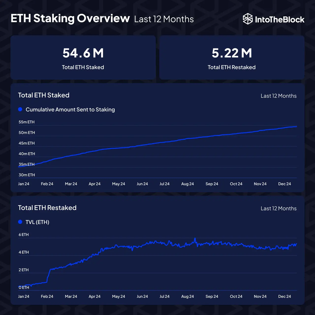 以太坊自 2024 年年初的质押量从不足 3500 万枚 ETH,升至年末的 5500 万枚。再质押数据方面,自年初爆发性增长后进入平稳期并保持在了 400 万枚 ETH 上方。