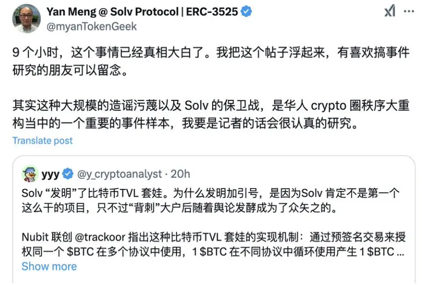 Solv团队反击这是阴谋论: Solv联合创始人@myanTokenGeek暗示,这场争议可能是一次有意的诽谤行动,暗指可能有组织的攻击企图针对Solv。