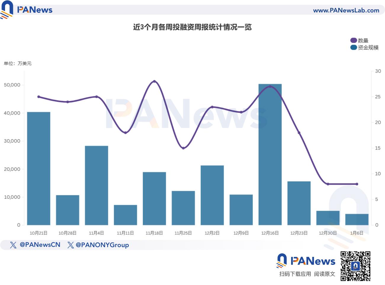据 PANews 不完全统计,上周(12.30-1.5)全球区块链有8起投融资事件,资金总规模超0.4亿美元,与前一周相比资金规模有所减少,概览如下: