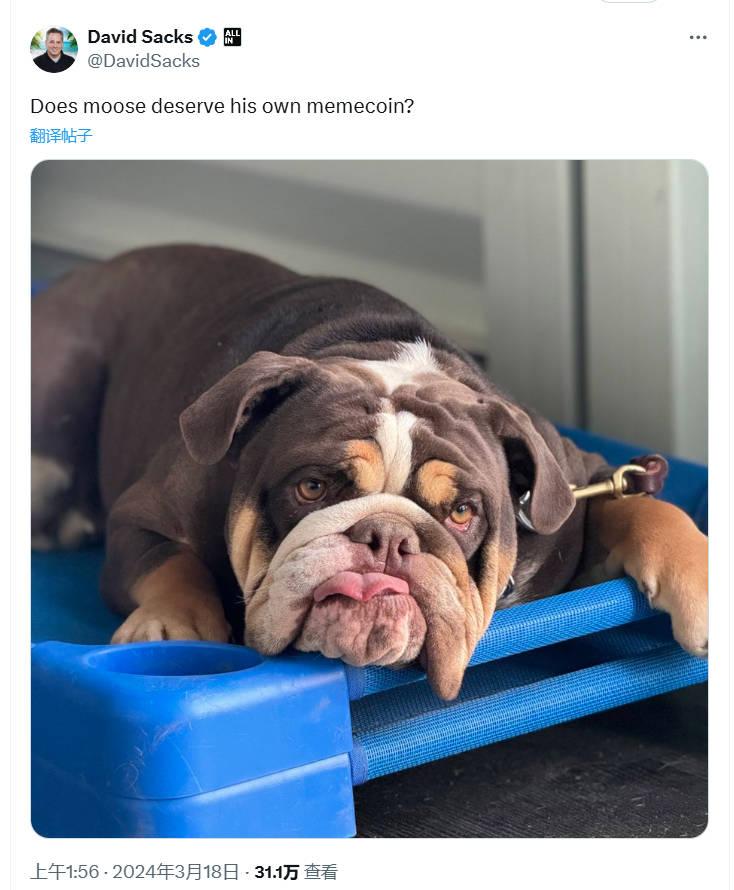 此外还有MOOSE、GUS,这两个meme币与David Sacks的宠物狗相关。Sacks曾经借Moose与项目方互动,也在X平台上,发推提起过Gus。MOOSE当前市值130万美元,GUS当前市值3.6万美元