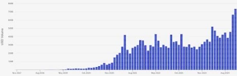 随着基础设施的发展大幅降低了交易费用, 2024 年稳定币的活动有所增加。值得注意的是,稳定币不仅用于加密货币交易,还用于跨境支付和汇款、购买商品和服务,以及在通货膨胀严重的国家作为价值储存手段。稳定币已经是转账成本最低的美元支付方式,我们预计越来越多的企业将接受稳定币付款。