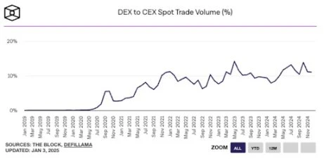 随着用户涌入区块链领域,我们预计在加密货币交易方面,去中心化交易所(DEX)的使用量相对于中心化交易所(CEX)会有所增加。毕竟,加密货币的核心前提是去中心化金融(DeFi)。随着 DeFi 生态系统的发展,过去几年去中心化交易所的现货交易份额稳步增长至约 11% ,我们预计这一趋势在 2025 年将继续。