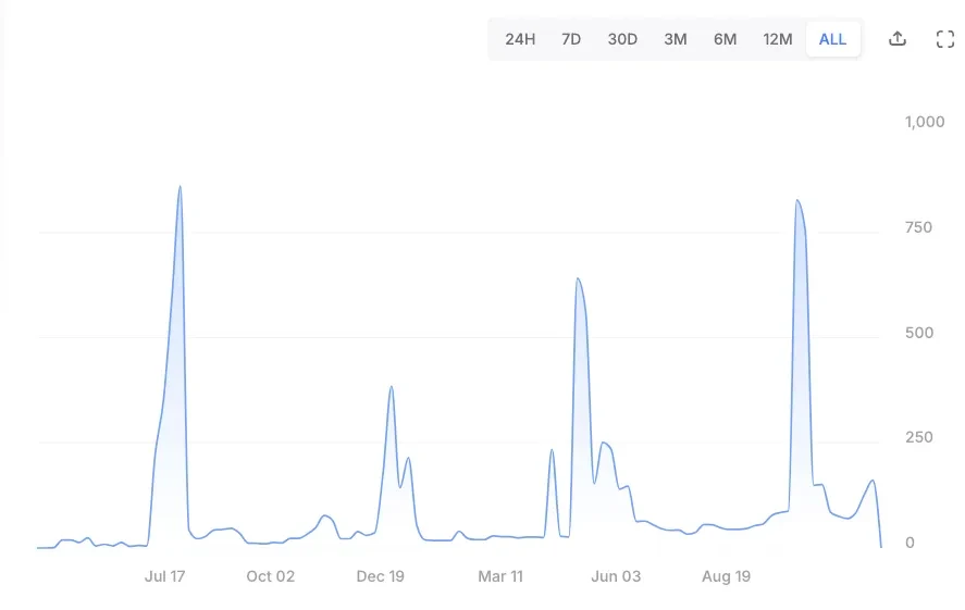 乍一看,似乎偶有陡增,但整体趋势表明 DeFi 在以太坊网络上的整体活动有所放缓。