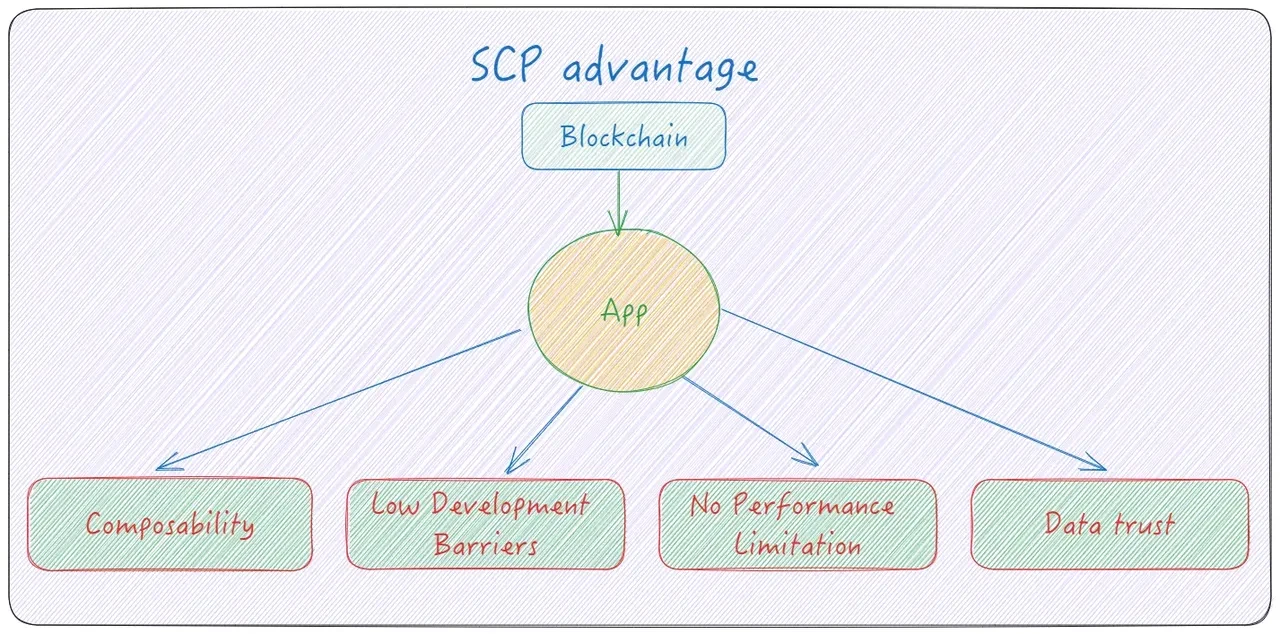 说了这么多,那么 SCP 具有哪些优势呢?SCP 通过将计算和存储解耦。这一设计不仅提升了系统的灵活性和组合性,还降低了开发门槛,并有效解决了传统区块链的性能限制,同时确保数据的可信性。这样的创新使得 SCP 成为高效且可扩展的基础设施,赋能未来的去中心化生态系统。