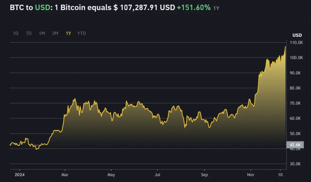 而在特朗普赢得选举,比特币在那之后,一路上涨 150% ,最高点已然达到 107287 美元