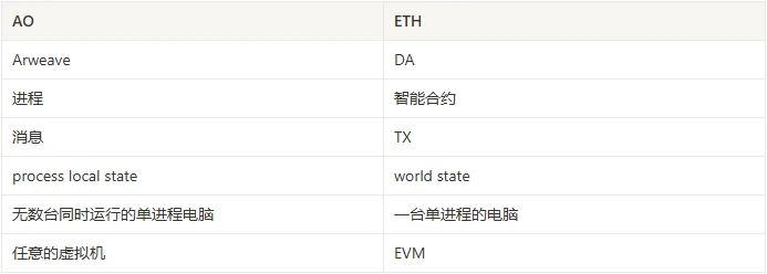 下面要我们通过一个表来看看 AO 和 ETH 的区别: